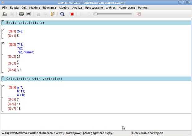 En primer lugar wxMaxima puede ser utilizado como una calculadora y un cuaderno. No sólo pueden realizar operaciones algebraicas simples, pero las variables de los nombres se pueden asignar valores y pueden ser procesadas, por ejemplo (fig. 1: cálculos con variables)