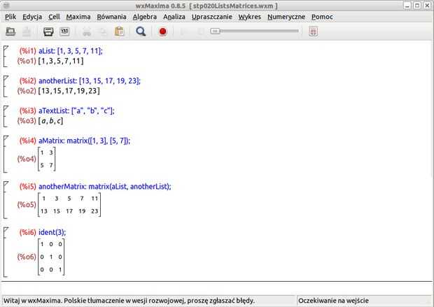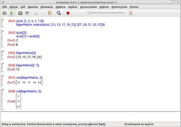 Acceso particular elemento de una lista o una matriz, pueden utilizar los soportes. Los índices comienzan con 1. Es posible acceder a un elemento de una lista con el nombre de la lista seguido de corchetes con el índice del elemento. Un elemento de una matriz se puede acceder con soportes también, pero los índices son el número de fila y columna. Puede accederse a una fila de una matriz con un índice de los soportes, o con la palabra clave 'row' (nombre y fila el número de matriz debe ser proporcionado como argumentos). Una columna de la matriz se puede acceder con la palabra clave 'col' (stp021ListsMatrices.png).