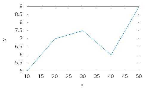 (% i18) wxplot2d ([discretos, [10, 20, 30, 40, 50], [5, 7, 7.5, 6, 9]]);