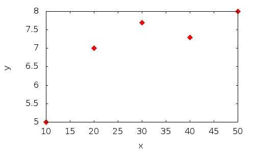 (% i19) wxplot2d ([discretos, 10, 5] [20, 7], [30, 7.7] [40, 7.3] [50, 8], [estilo, puntos] [point_type, diamante], [color, rojo]);