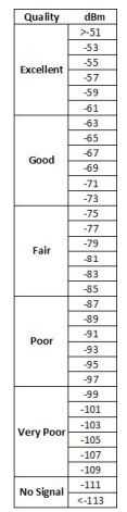 Los datos de la tabla la calidad de la señal de cada red y será utilizado para medir la relación de poder en decibles (dB) de la referencia de potencia medida a una milliwatt(mW).