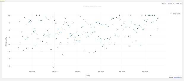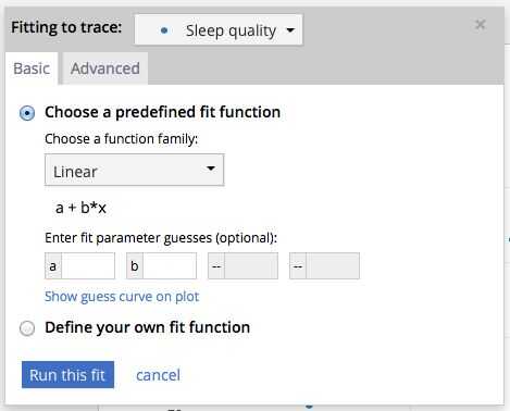 Para este próximo paso depende de usted qué datos desea ver. Para mí, decidí mostrar porcentaje de calidad de sueño cada noche. Para ello, he seleccionado la fecha X y la calidad Y de ser. Una vez seleccionada la fecha deseada, haga clic en diagrama de línea. (Usted puede hacer una trama de línea o un diagrama de dispersión, elegí un diagrama de dispersión) A primera vista, debería ver algún tipo de relación, pero para una versión más detallada y r-valor, haga clic en rastrear de forma, añadir un linear fit y ejecutarlo.