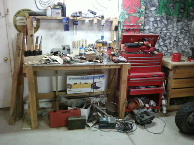 siempre tengo todas mis cosas en el piso. Así que decidí hacer un banco de trabajo. Pero porque yo no pude ponerlo en el garaje que pensé que me iba a movabable. Es un proyecto difícil. Tarda unos dos días para hacer. Y es algo grande y pesado así qu