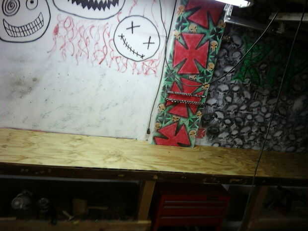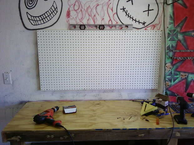 La segunda cosa que quería era perforado, no tengo fotos de cómo había montado lamentablemente pero puedo decirte como lo hice. Tuve un par piezas de repuesto de pino que queda de un proyecto por lo que arrancó abajo que sobre el mismo grosor que una tira de 1 x 1 en una tienda de mejoras para el hogar. Entonces hizo en esencia un marco de imagen para la parte posterior de la pegboard con una tira extra en el centro de apoyo. Luego encontrar tacos y asegurada con tornillos 3".