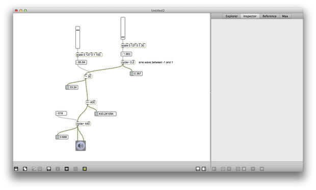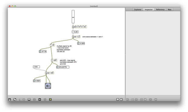 Podemos hacer esta modulación de la frecuencia más automático mediante el envío de una señal en la entrada izquierda de ciclo ~. Crear otro ciclo de ~ objeto, establece éste a una muy baja frecuencia como 0,2 hz por lo que podemos escuchar más claramente. Agregar 400 a la señal con un + ~ objeto y cables dentro del ciclo. Si usted escucha muy de cerca usted puede escuchar el tono de la señal de salida cambia muy levemente, esto es porque por defecto la amplitud del ciclo! ~ objeto es 1, por lo que la modulación de frecuencia es sólo hacer pivotar entre 399 y 401, que es muy pequeña. Aumentar la amplitud de la modulación multiplicando la salida del ciclo de 0,2 hz ~ 30 antes de agregar a 400, ahora la frecuencia del segundo ciclo ~ objeto vaivén de 370 a 430hz.