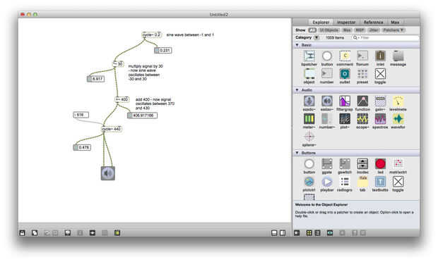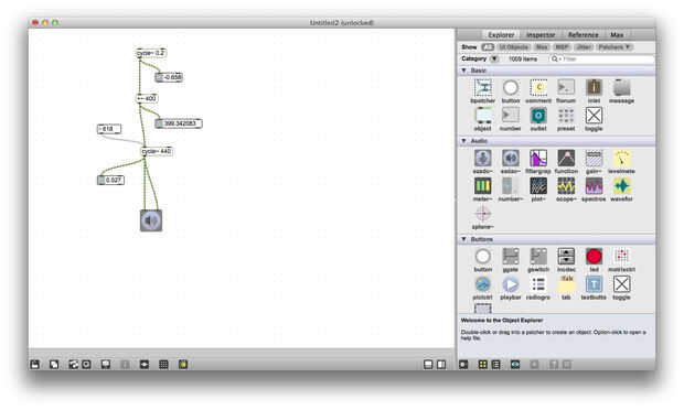 Si nunca has trabajado con un sintetizador analógico, este próximo proyecto será muy familiar. Vamos a empezar otra vez con una onda sinusoidal simple. Si enganchamos un objeto número a la entrada izquierda del ciclo ~ objeto, puede cambiar la frecuencia de la onda senoidal. Poner el parche en modo de bloqueo y arrastre en el objeto número arriba y abajo y escuchar a la salida, esto se llama "frecuencia modulada".