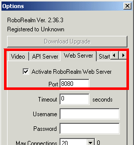 El módulo de servidor web le permite ver las imágenes que procesa RoboRealm sobre la web utilizando un navegador web normal. El servidor web dentro de RoboRealm está desactivada de forma predeterminada y debe activarse antes de convertirse en activo. Para activar el RoboRealm WebServer seleccione la casilla de verificación en el cuadro de diálogo de opciones como se ve abajo. Puede ver esta interfaz haciendo clic en el botón "Opciones" en el cuadro de diálogo principal de RoboRealm.