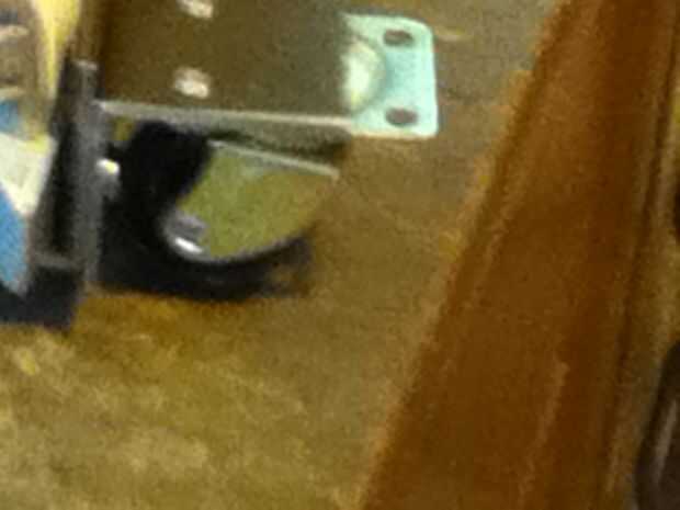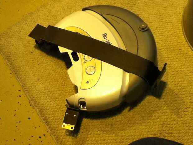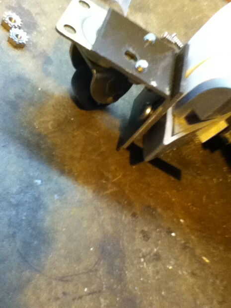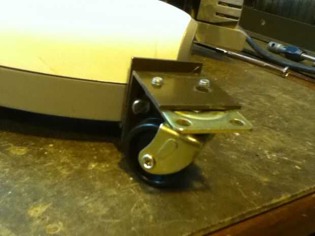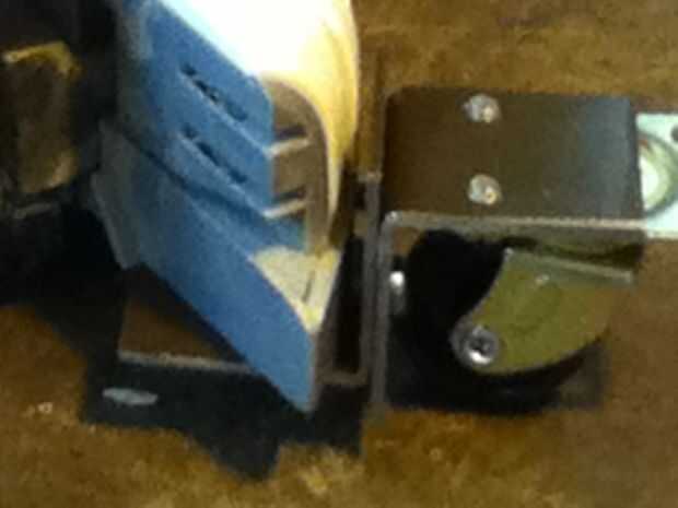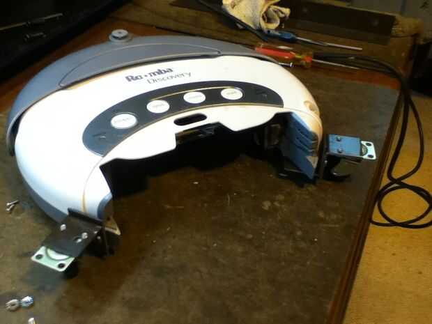 La platina del VCR fue utilizado básicamente como repuesto del metal de hoja, para hacer dos tiras largas que se cruzan para sostener la papelera que tiene una circunferencia un poco más grande que el Roomba. Se enrosca en las ruedas en la parte posterior.