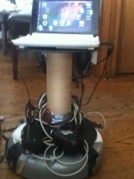 Hacia la parte posterior de la roomba (cerca de la basura), si le da la vuelta boca abajo, hay dos agujeros. Tiene 2 ruedas de 1" y hecho dos soportes. Creo que las fotos mejor describen esto. Entonces, un 2 soportes adicionales se perforaron en la papelera para que se sienta en las ruedas traseras y la parte delantera va dentro de los titulares de hecho en el frente. También se hizo un agujero para el sensor de infrarrojos por lo que todavía puede acoplar normalmente y todo en la parte superior de los cables. El monitor fue perforado en la parte superior. (Imágenes en la diapositiva final)