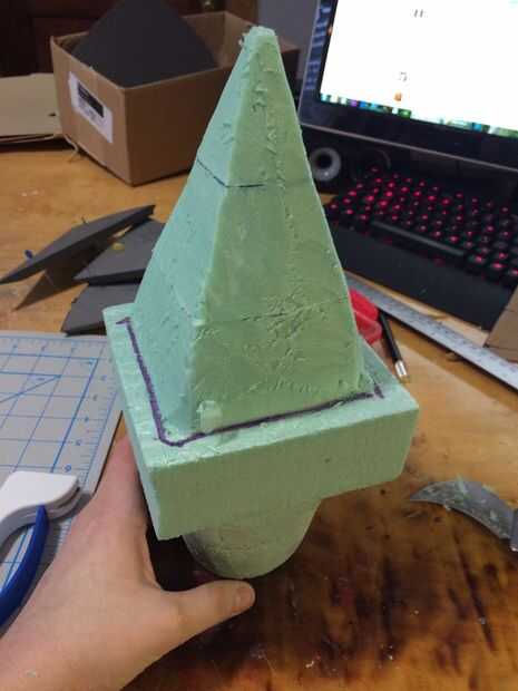 ¡ Cortar formas square-ish que eran más pequeños que salió a la punta y pegarlos juntos! Pegamento caliente y muchos otros pegamentos como el cemento de contacto fundir este tipo de espuma pero si sólo utilizas un poco de pegamento caliente para sujetarlo todo con intenciones de añadir Worbla más tarde debe ser fino. Sólo asegúrese de que no es en ninguno de los bits externos como se crean guiones feos.