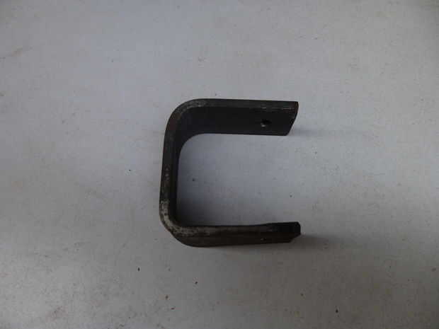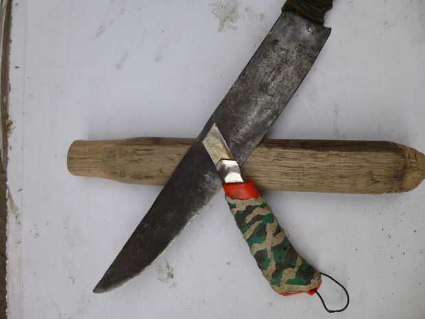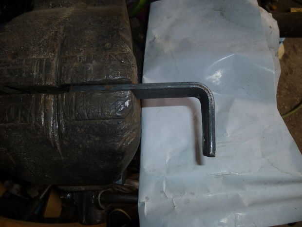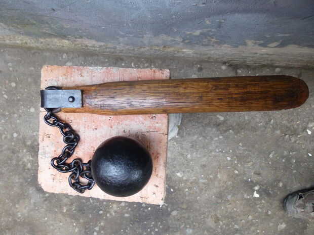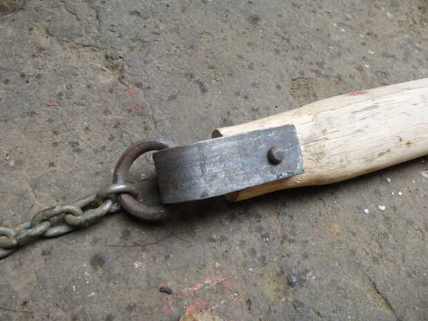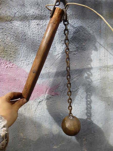 Primero talló el mango de madera. Luego hizo una figura C en hierro y colgado en la manija con un remache de hierro. Finalmente soldó con autógena el cms.chain 40 a la bola del hierro y la pintura en negro.