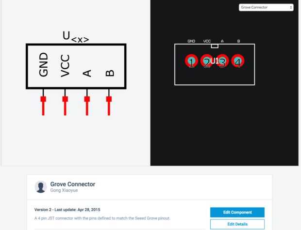 Haga clic en "+ componente" botón en la esquina superior derecha de la interfaz de circuitos 123D. Haga clic en "Todos los componentes" en el panel que aparece. Tipo de conector"Grove". Haga clic en opciones y leer la descripción de las nuevas páginas sobre los componentes. Compruebe el componente (https://123d.circuits.io/components/762245). También puede diseñar sus propias piezas y dejar que otras personas use en circuitos 123D!