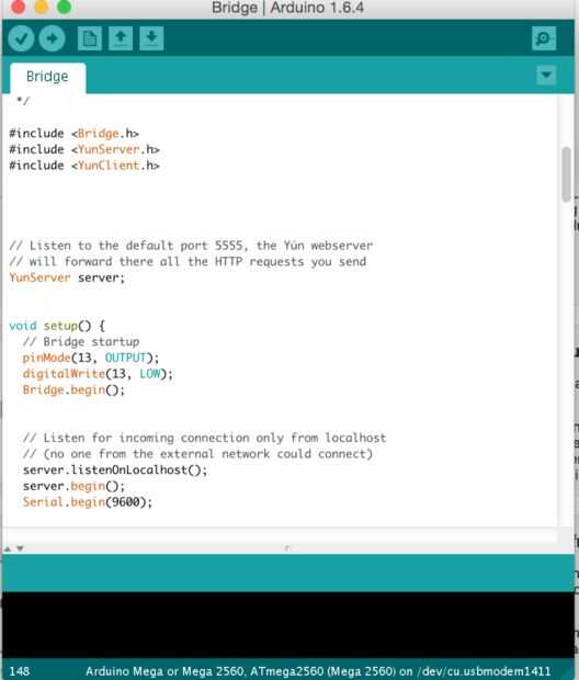 Crear un archivo .ino en Arduino, pega los siguientes códigos y guardarlos. Había llamado "Bridge.ino".