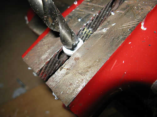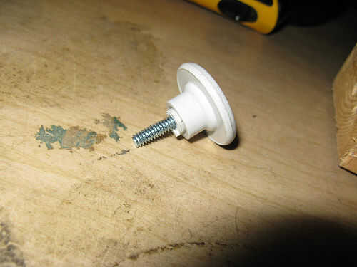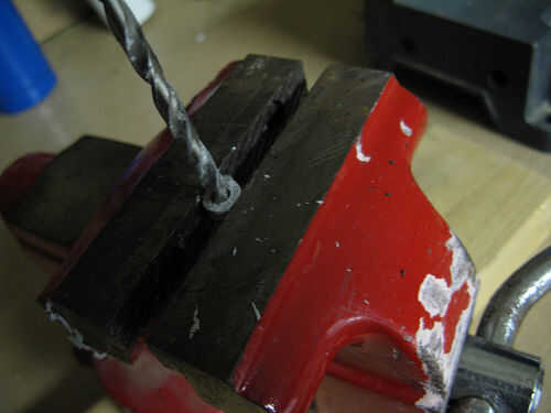 Perfore el buje para que #8, #10 o tamaño de perno se ajusta a través de. Si no tienes un avellanador, utilice un taladro de gran tamaño hasta una cabeza plana perno va a quedar al ras. Usted probablemente más crack y destruir el buje. Eso es aceptable, ya que sólo actuará como separador.
