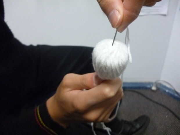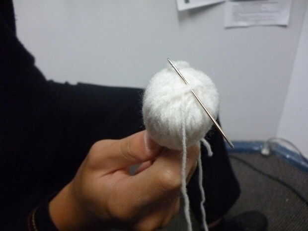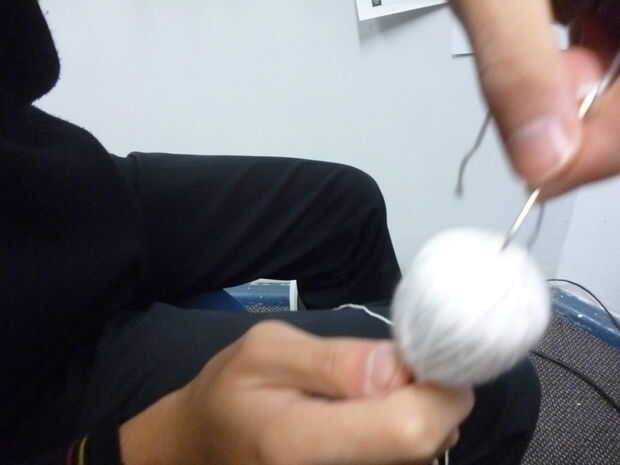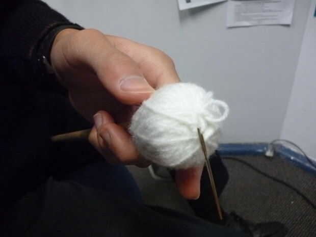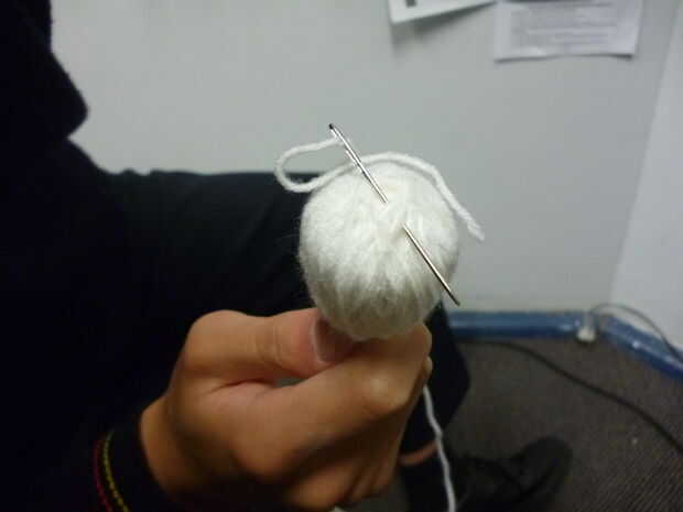 1. Empuje la aguja en la parte superior del mazo, en el interior borde del círculo hecho en el paso 10. Debe salir en el borde exterior del mismo círculo. Tire firmemente. Ver imágenes.