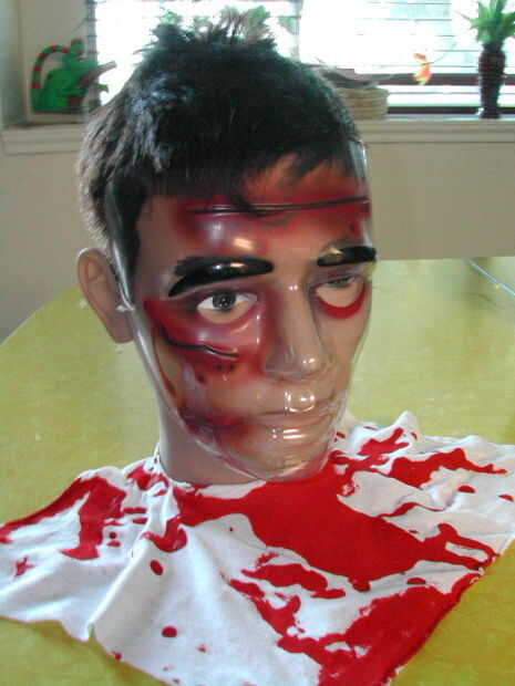 Poner la máscara barata en la cabeza. Tuve suerte, que encontré una máscara clara que parecía tenía cortes y sangre en él.