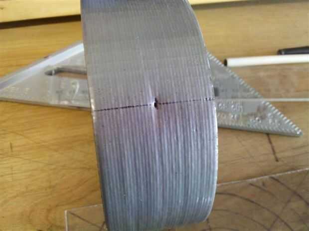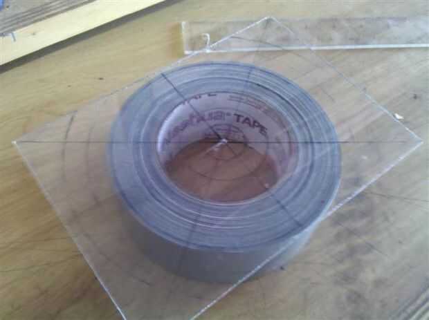 Tendrá que medir y marcar los puntos donde hay que taladrar los agujeros en su rodillo de la cinta de pato. He hecho la guía de lexan en la imagen un tiempo atrás para encontrar un centro de áspero de forma extraña piezas de madera para trabajar en el torno.