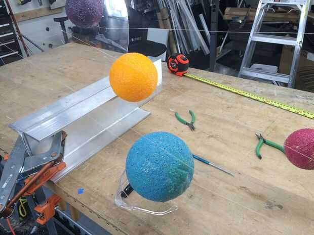 La línea de pesca a través del hilo de rosca y atar nudos en cada extremo lo suficientemente grande como para no deslizarse a través del orificio que ha perforado. He encontrado esto para ser la más perfecta forma de suspender las bolas. Asegure con un pegamento de acrílico/plástico o caliente.