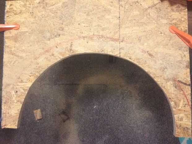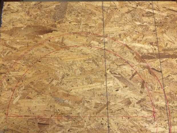 Con 3 de sus hojas de chip, mida * al menos * 20 "x 12" cuadrados. Usando su escriba o escribano improvisada, mida por lo menos 6 círculos semi de diámetro 19,1". Use una sierra de cinta o una sierra de calar para recortar el tablero de viruta en el semicírculo, como se muestra en las fotos anteriores. Para probar que su corte es correcto, ponga sus tapas dentro del círculo de semi y ver que encajan.