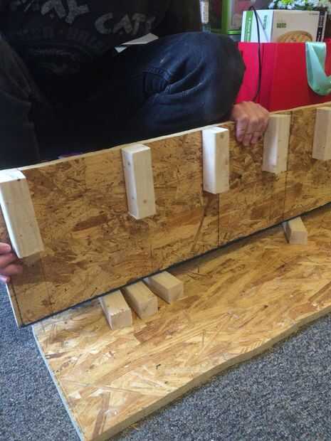 Corte la barra de 2 "x 2" en 12 rectángulos hasta por lo menos 4 "alto. Línea a una distancia uniforme entre sí; una regla y una escuadra serán tus mejores amigos. Si no es exactamente, no es el fin del mundo, pero usted tendrá una oportunidad menos de un fregadero en su forma de calor. Desde el conglomerado en la madera, perfore dos tornillos de pared seca con su taladro.