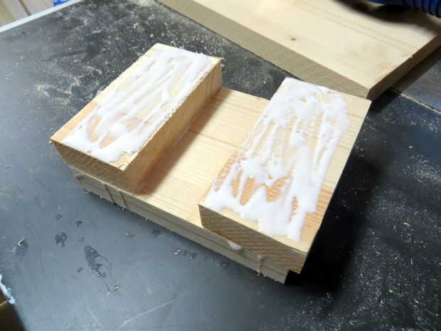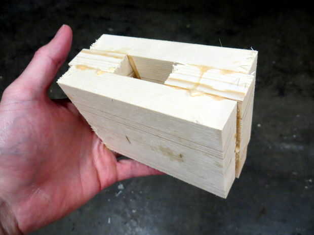 Coloque el mango exactamente en el centro de una de las piezas de 120 x 90 mm, 25 mm del extremo más ancho del mango que sobresale más allá de la parte superior de la cabeza de mazo. Ahora pega las piezas de 45 mm en la parte exterior de la manija (aunque no pegue la manija sí mismo). Abrazadera, quitar la manija, limpiar cualquier pegamento de exprimir hacia fuera desde donde el mango se vaya y deje secar durante al menos 20 minutos. Pegamento y fije la capa final del sándwich en. Parece horrible; no preocuparse por ello. La magia sucede en el siguiente paso...