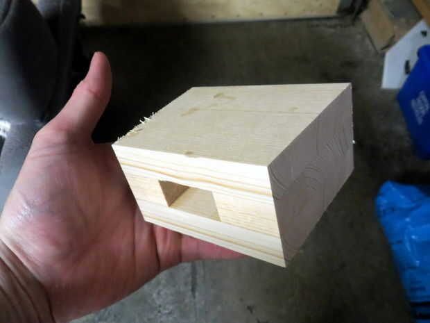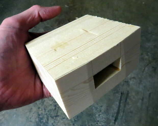 Ahora que tienes la cabeza todo firmemente pegada juntos, es tiempo para que se vea bonito. Hice cortes 85 grados a cada lado para hacer un trapecio y luego dos más de 90 grados a las caras nuevas a través de donde emerge la manija desde la parte superior. Seco montar el asa, si el macillo es demasiado grande, ajuste que le conviene mejor.