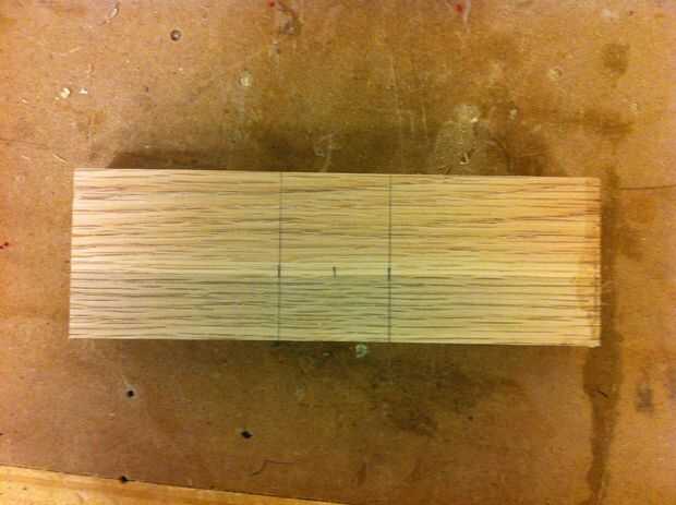 El siguiente paso es la marca una de las tiras más pequeñas para insertar el mango. Hago mío 1-1/4" de ancho por lo que pude pulir el mango para que se ajuste perfectamente. Pongo minas en el centro por lo que podría tener un mazo equilibrado.
