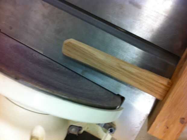 Siguiente tomé mi mango pegado y comenzó a moldear en la lijadora de disco para redondear los bordes. Esto para mí para asegurarse de que hice bien y lo consiguió al tamaño correcto. Luego terminé lo para arriba con la lijadora de Palma más adelante.