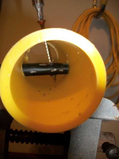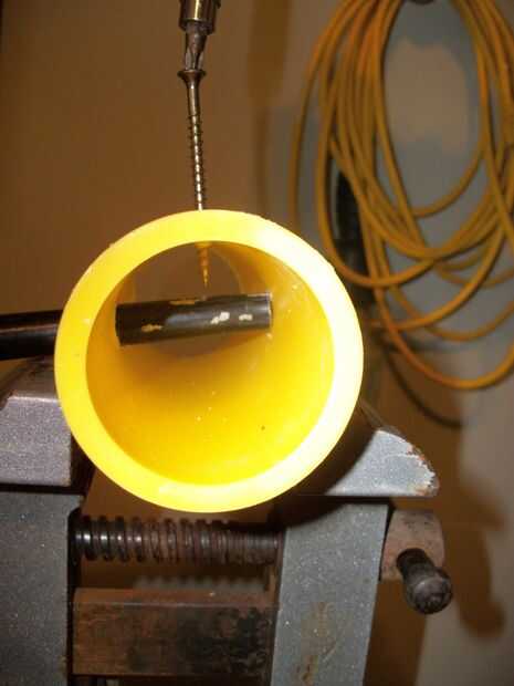 Después de haber completado toda la cabeza fuera de la perforación, es el momento de montarlo permanentemente al polo. Esto es donde puede ser difícil. He visto chicos hacen esto de muchas maneras, pero le mostrará la manera más rápida y sencilla. Es cómo todos mis jefes se montan y yo nunca hemos tenido uno aflojar o romper. No quiero nada que sobresale de la cabeza por motivos de seguridad tan selectos y un tornillo de madera de 2,5 pulgadas y perforar en el lado de la cabeza en línea con donde el poste de palillos en el centro de la tubería. Después el tornillo de ejercicios en la barra de metal seguir conduciendo el tornillo a través del poste hasta que es hundido todo el camino. Con un tornillo de madera de 2,5 pulgadas, único y una poquito de la punta se asoman hacia fuera. Utilice una lima de mano para alíselo