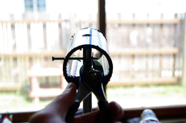 Coloque la tuerca de T en el 8/32 agujero y rosca el tornillo a través de la cabeza y el eje, en él. Una vez que los hilos están ocupados, sostener la tuerca en T con un par de pinzas y atornillar el tornillo hasta el fondo.
