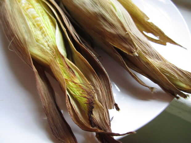 Asado en una parrilla en el centro del horno durante 35 minutos a 350 F. Si tienes pequeñas mazorcas de maíz, puede tomar menos tiempo. Mantener olor - cuando huele como el maíz, lo más probable es que ya es hora de que salga!