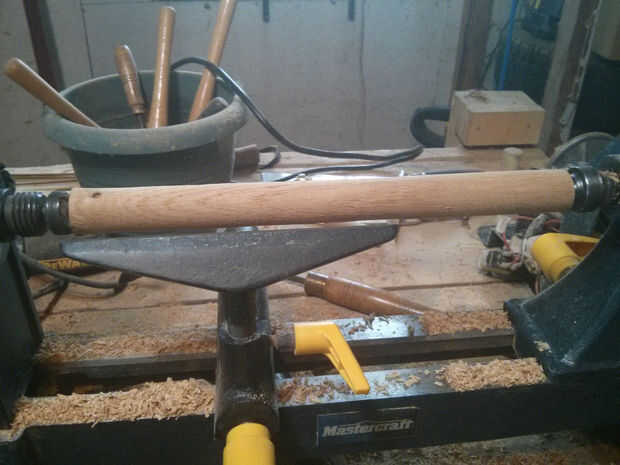 Su espacio en blanco en su torno y reducir hasta que tenga una clavija que es aproximadamente 1" de diámetro. Comenzar por reducir una sección de 1", en un extremo, un diámetro de 1/2", estrechándose hacia abajo del diámetro de la espiga de 1". Esto creará la toma que se fijan a la cabeza. Usted querrá dejar un poco de material, en el extremo para el mandril de la contrapunta que puede cortar más tarde.