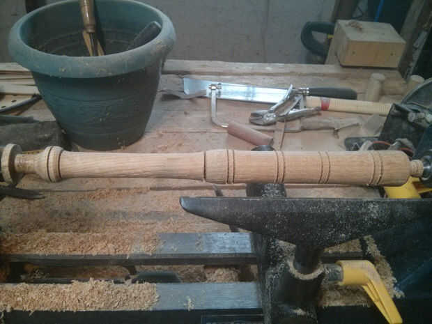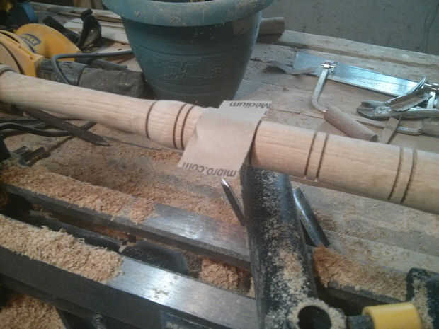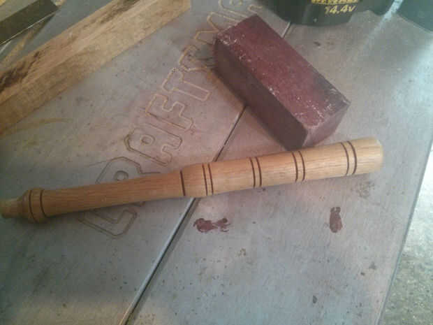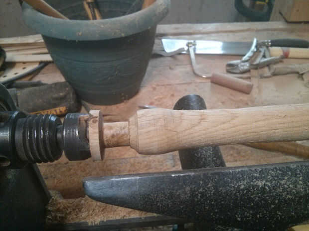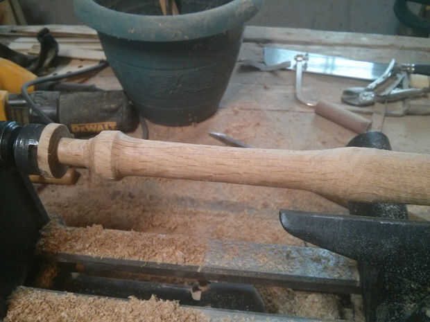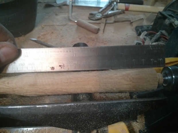 Ahora, para peso y balance, se debe reducir la sección entre el extremo de enchufe y el mango a un diámetro de 5/8", dejando un 3/4" x 1" espesor cuello amplio ' entre esta sección y el encaje. Esto le ayudará a distribuir el peso en el mango y el extremo principal, centrado directamente el equilibrio entre.