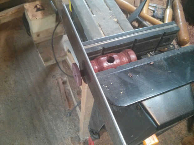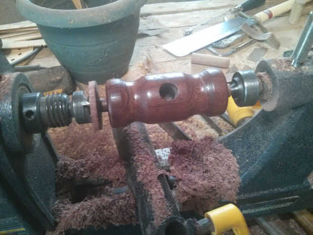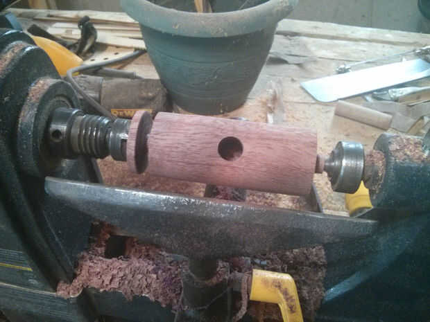 Comience reduciendo sus cuadrados de 1,5 "x 4" existencias, en su torno hasta su vuelta. Generalmente quiero reducir el material cerca de los mandriles de cabezal y footstock, en este punto, asegurando que soy capaz de encontrar el centro exacto de la cabeza. Una vez situado el centro exacto, quitarlo del torno, coloque en mi taladro y perfore un orificio de 1/2" que es 1" de profundidad. La razón que me gusta hacer el agujero temprano es que trabajos de acabado también limpia los bordes del agujero, asegurándose que esté limpio con ningún material deshilachado en los bordes.