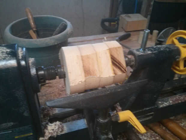 En ocasiones, lo corte de las esquinas antes de encender, sin embargo en esta pequeña obra que no es necesario. Con la velocidad de su torno en lento y una buena gubia afilada, puede hacer que la pieza redonda muy fácil.