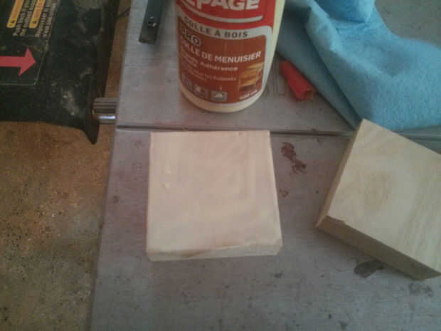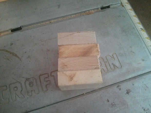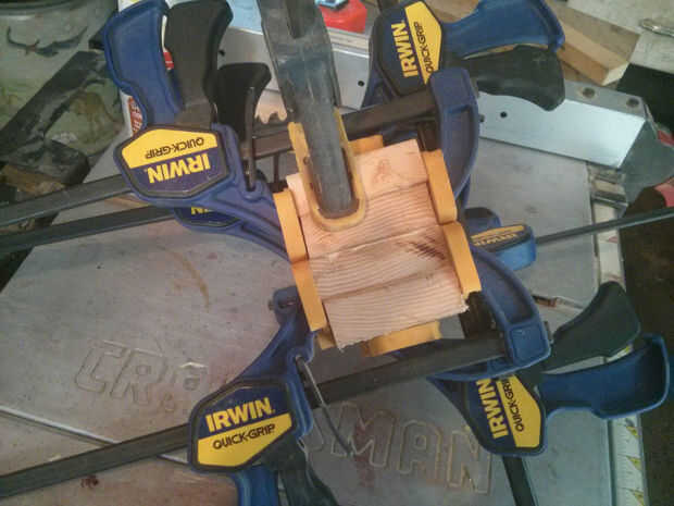 La construcción de este cabezal es un poco diferente. Queremos que el grano de la madera a ser horizontal al martillo sí mismo para la fuerza. Para empezar, tomar sus cuatro, 1" espesor x 3" x 3" bloques y encolarlos, les apriete bien y déjelos secar durante varias horas. Una vez que estén seco, puede establecer el bloque completo en su torno.
