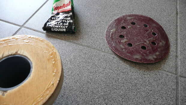 F: Pegue el lado 'áspero' del papel de la arena y la parte inferior del anillo de madera contrachapada. Dejar el papel de lija y la madera se seque durante un minuto antes de ponerlos juntos.