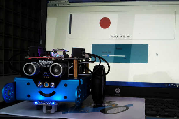 En este Instructable, construimos un mBot interactiva con JavaScript. Con marco de Johnny cinco, somos capaces de robótica programa con JavaScript. Se establecerá una interfaz web basada en Socket.io interactuar con mBot. Podemos reproducir sonidos diferentes y empujar una bola horizontalmente en la interfaz web dependiendo de la distancia entre el obstáculo y el sensor del sonar de mBot. La velocidad del motor puede ajustarse desde la botella en la interfaz web. Por lo tanto, vamos a empezar!