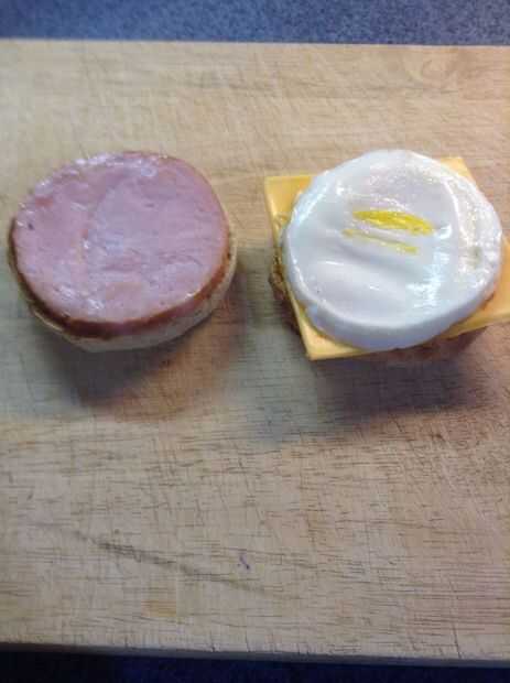 Cepillo algunos margarina derretida en el interior corona del panecillo inglés. Luego coloque el tocino canadiense caliente encima de la corona margarined. En la parte interior inferior de la muffin colocar el queso, luego el huevo cocido. Coloque la corona sobre la base y BAM! Su tiene usted mismo un McMuffin de huevo!! Disfrutar! No olvide votar para esta instructableand siga mefor más deliciosas comidas!