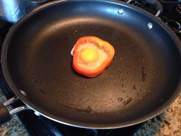 Un anillo fuera el pimiento cortado Aceite de la sartén y calor a alta Coloque el anillo sobre la bandeja Romper el huevo en el ring Y ganas de cocinar!