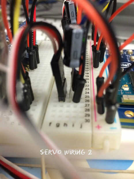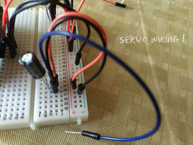 A continuación os mostramos el cableado necesario para conectar el cable de servo--conexión de 3 pines que salen del servo-rojo (vcc), black(ground) y en mi caso white(signal). La imagen (cableado 1 Servo) muestra el capacitor de 220uF conectado entre vcc y tierra – esto es necesario para cada servo con el fin de evitar los problemas de voltaje. Como estamos usando la misma fuente de la batería para alimentar los servos y la Junta; en rover repentina vuelta de direcciones, puede haber picos de corriente que puede causar que el tablero reciclar si no proporcionamos un condensador considerable (220uF funciona bien en nuestro caso). Las imágenes muestran el cableado para 1 servo sin el cable del servo conectado (Servo cableado 1); con el servo cable conectado (Servo cableado 2) y luego conexión los cables de servo.