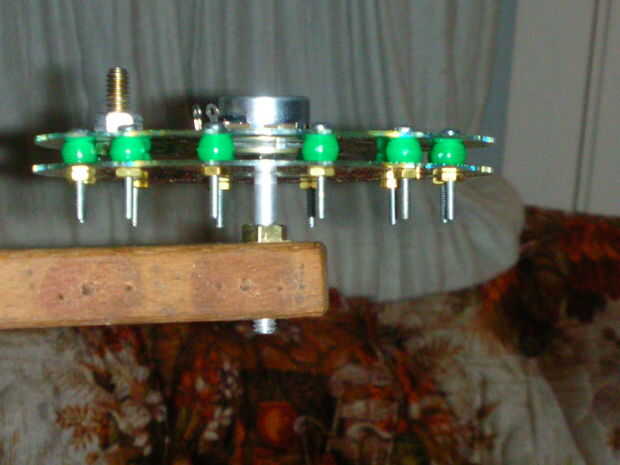 El segundo 1/4-20 tuerca hexagonal en el eje del potenciómetro del hilo de rosca y apriete la tuerca de modo que los puntos de carrusel hacia adelante cuando el potenciómetro está en el centro exacto de la escala analógica. Marqué la punta del eje con el marcador sharpie para facilitar esta tarea.