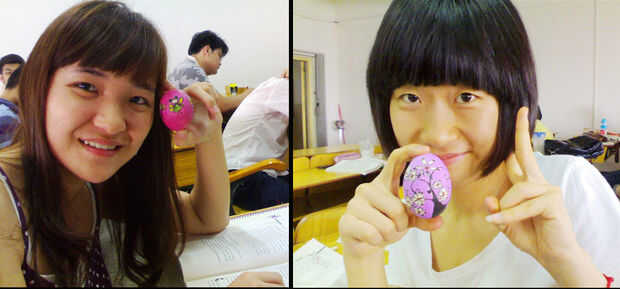 Hace años cuando estaba en la Universidad, mi profesor Miss.Hong me dijo que su hija estaba molesta porque su pintura de huevo fue destruido por un niño travieso. Miss.Hong sabía que me gustaba dibujar, así que me preguntó si me gustaría ayudar a. Por supuesto le dije que sí. Le dio 2 cáscaras de huevo vacías a mi bff Jessie y yo. No es una causa de fácil tarea que necesitamos tener realmente cuidado no lo de la miga. La primera foto fue tomada después de terminar a la "misión". Jessie en la izquierda y yo a la derecha.