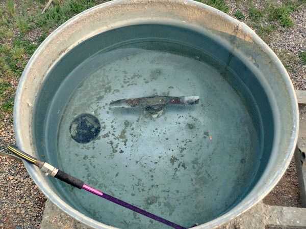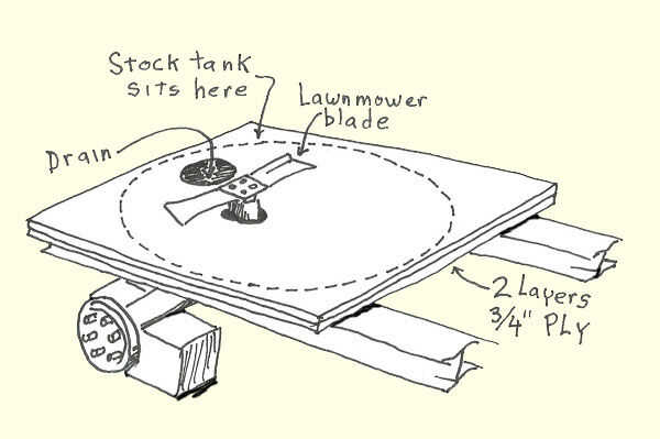 Para conseguir el papercrete fuera de la batidora necesitaba un drenaje. Me quité el depósito y cortar un agujero que era la circunferencia de la llanta de camión. Cortó un tercio del tubo interior y deslizarse a través del agujero en la madera contrachapada y había asegurado con dos tornillos. Parece que la trompa de un elefante sobresale de la parte inferior! Corte un agujero correspondiente en el depósito de valores, pero había hecho el agujero de una pulgada más pequeña para que pudiera cortar las lengüetas y doblarlas hacia abajo para asegurarlo el tanque sobre el dren. Yo todo bien atornillados y había sellado la junta entre el diferencial y el tanque con bondo. También hice una aleta debajo del remolque para celebrar el cierre del drenaje. Todo que permanecía era fijar la cuchilla del cortacésped para el diferencial y tuve un mezclador.