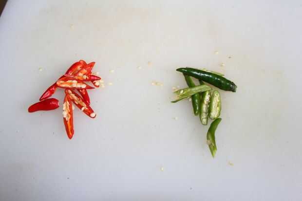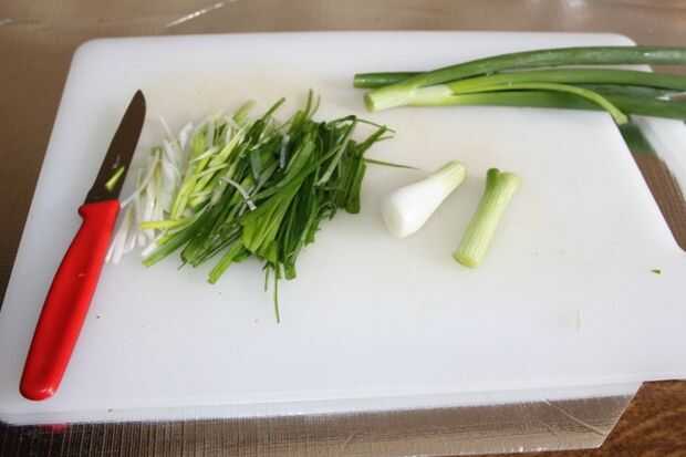 Cebollas de primavera debe ser finamente rebanadas en fresco a lo largo (sobre el tamaño de un dedo) chiles rojo y verde son una opción. Me gusta mi comida para estar un poco caliente en mis cocinas se agrega. Si usted desea utilizar, cortar los chiles también en longitudinal.