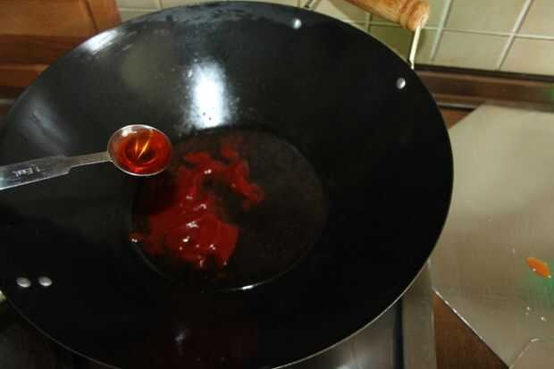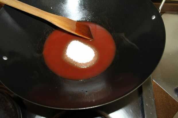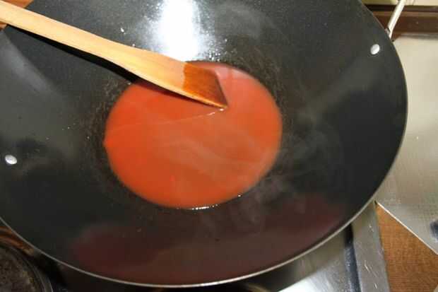 Caliente el wok a fuego lento y vierta el vinagre, agua, salsa de pescado y salsa de tomate. A continuación añadir el azúcar y revuelve en fuego lento hasta que se disuelve.