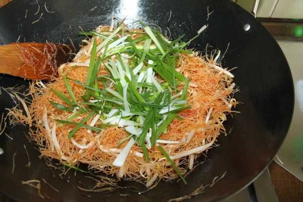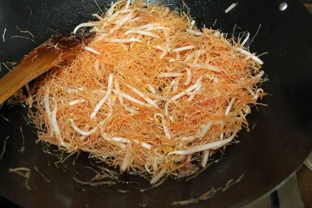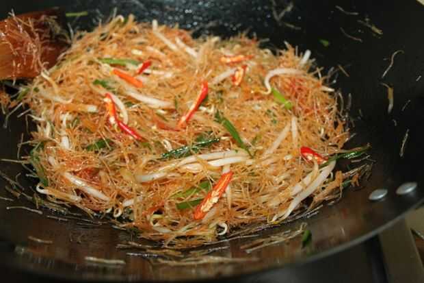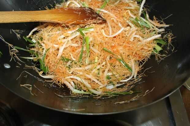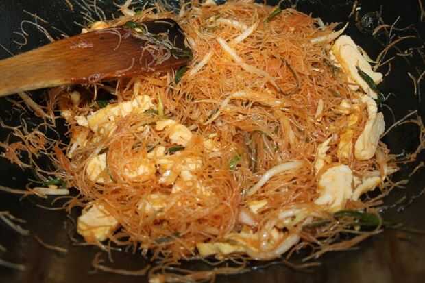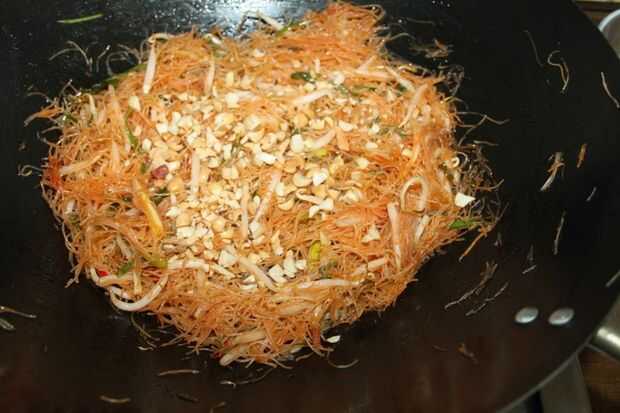 Ahora agregar los fideos vermicelli cocidos, brotes de soja, la mayoría de las cebollas y los chiles (si se usa) y los cacahuetes picados. Estos tiene que ser cocinada a fuego muy muy lento. Revolver hasta que los fideos han absorvido todo el liquid.last de todo tirar en el Omelet en rodajas y retire del fuego.