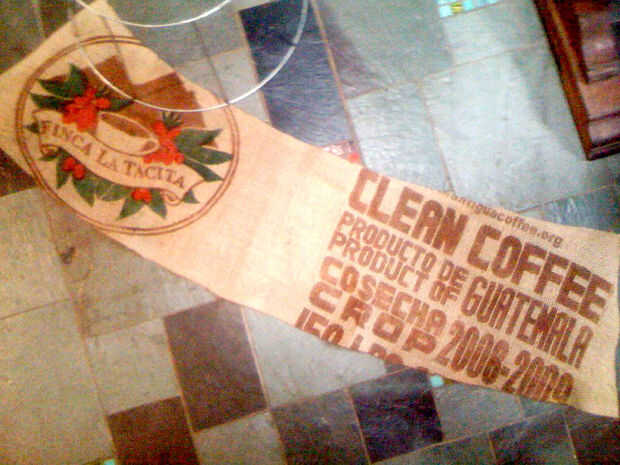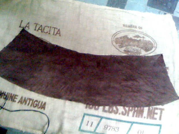 Empezar a envolver a la tela alrededor de su sombra. He utilizado pegamento para adherirla alrededor del marco de alambre y entonces "cosido" en el marco con el yute (arpillera como hilo, encontrado en ferreterías) y una aguja grande.