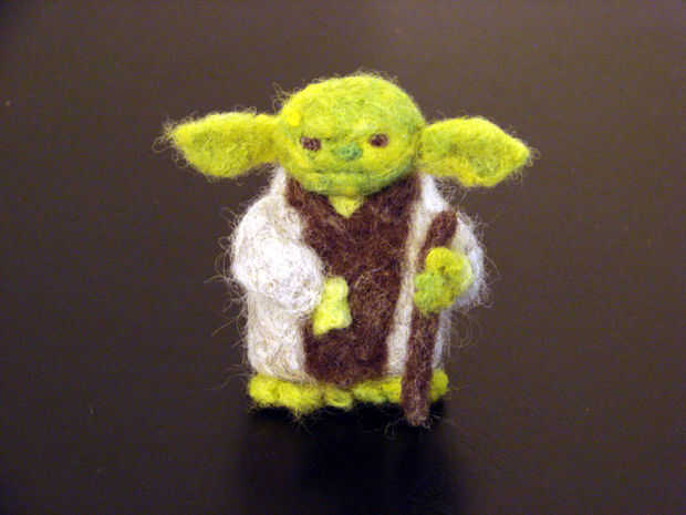 Tres pulgadas de alto, Yoda se hace de lana afieltrada. Capa de Yoda es realmente lana de las ovejas de nuestro amigo. Hice su núcleo por bateo de poliéster en un cuerpo y una cabeza, seperatly para Afieltrar. Me cubrió la cabeza de Yoda con mezcla de lana verde y fieltro en la base. A continuación, dos orejas de fieltro y había atado a la cabeza. "Había esculpida" la cabeza por punción sus tomas de boca y ojos. A continuación os adjunto una nariz y dos ojos pequeños. Decidí dejarlo "cute" en vez de hacer demasiadas arrugas como él es, ejem, la vida REAL. :)