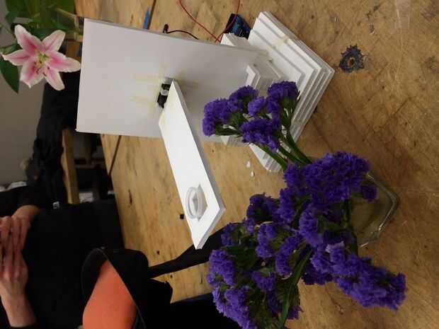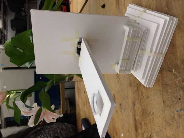 2. hemos querido tener un movimiento de 90 grados de la tapa riego pequeña que fue provocado por cuando nuestro esbozo de tratamiento recibió un mensaje de la fotorresistencia. Hemos construido una pequeña plataforma con un brazo fuera de espuma y cinta. Esencialmente, el brazo se encuentra en la parte superior del motor servo y se inclina con el movimiento del motor. Se refieren a las fotografías.